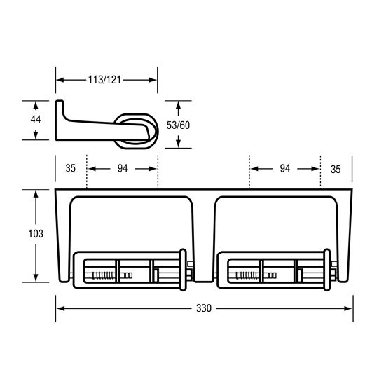 - Holds two standard toilet roll