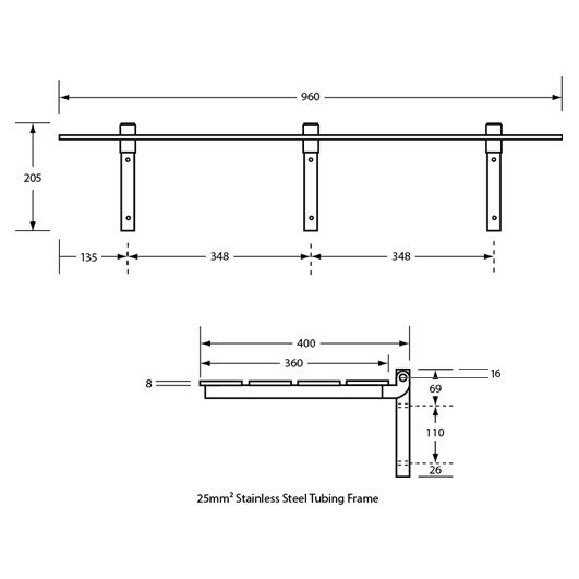 METLAM ACCESSIBLE FOLDING SHOWER SEAT 960MML X 400MMW WITH 13MM WHITE COMPACT LAMINATE SEAT TOP & SATIN STAINLESS STEEL FRAME