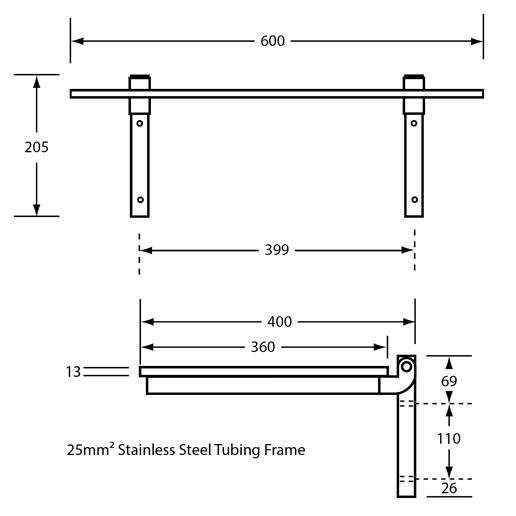 METLAM FOLDING SHOWER SEAT 600MML X 400MMW WITH 13MM WHITE COMPACT LAMINATE SEAT TOP & SATIN STAINLESS STEEL FRAME
