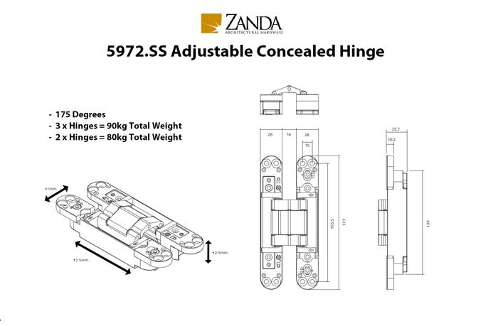 ZANDA 5972 ADJUSTABLE CONCEALED HINGE 175 DEGREE 90KG SSS