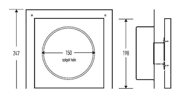 Size : 250mm x 250mm overall, with conduit that fits most standard ducting (150mm spigot).Finish: Steel centre panel (Appliance White as standard), with black powder coated internal housing.
